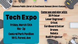 Explore fun tech for all ages at the Chanute Public Library's Tech Expo! Kids and families will be able to explore 3D Printers, Laser Engravers, Cricut, a Kids Cardboard Cutter, Drones, Robots, a Budii Projector, and VR Headsets. Technology is provided in collaboration with the Southeast Kansas Library System.